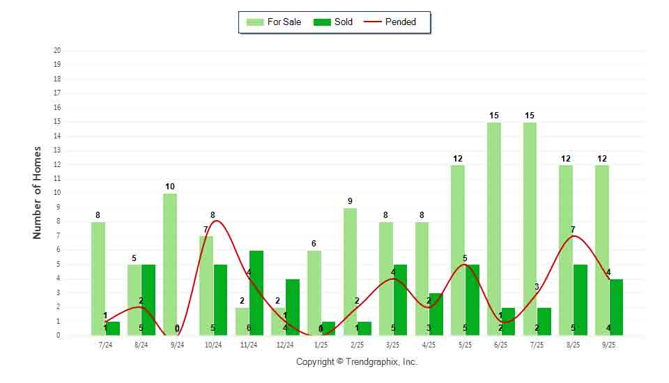 September 2025 was a Neutral market! The number of for sale listings was up 20% from one year earlier and the same as the previous month. The number of sold listings was 4 and decreased 20% month over month. The number of under contract listings was down 42.9% compared to previous month. The Months of Inventory based on Closed Sales was 3, down 70% from the previous year.