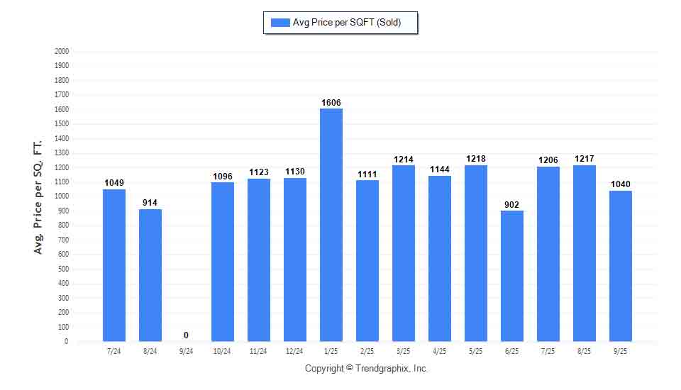 The Average Sold Price per Square Footage is a great indicator for the direction of property values. Since Median Sold Price and Average Sold Price can be impacted by the 'mix' of high or low end properties in the market, the Average Sold Price per Square Footage is a more normalized indicator on the direction of property values. The September 2025 Average Sold Price per Square Footage of $1,040 was down 14.5% from $1,217 last month.