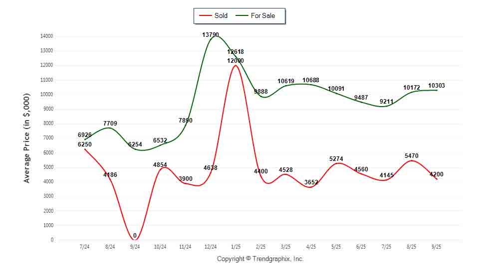 The Average For Sale Price in September was $10,303,000, up 64.7% from $6,254,000 in September of 2024 and up 1.3% from $10,172,000 last month.