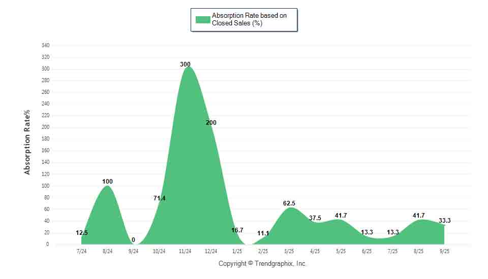 The September 2025 Absorption Rate based on Closed Sales of 33.3 was down 20.2% compared to last month.