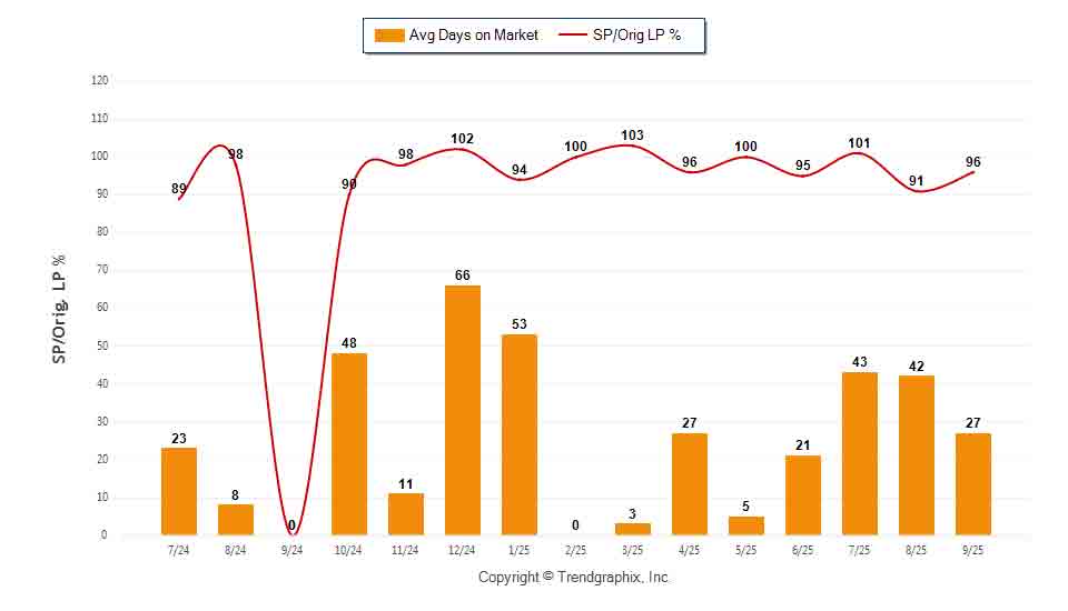 The average Days on Market (DOM) shows how many days the average property is on the market before it sells. An upward trend in DOM trends to indicate a move towards more of a Buyer’s market, a downward trend indicates a move towards more of a Seller’s market. The DOM for September 2025 was 27, down 35.7% from 42 days last month.