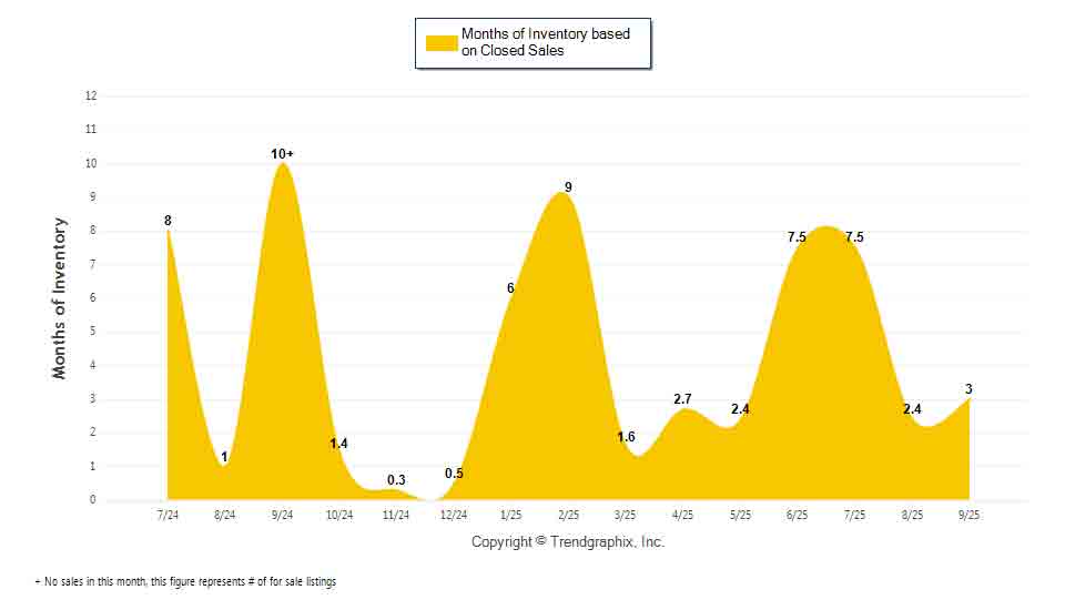 The September 2025 Months of Inventory based on Closed Sales of 3 was decreased by 70% compared to last year and up 25% compared to last month. September 2025 was Neutral market.